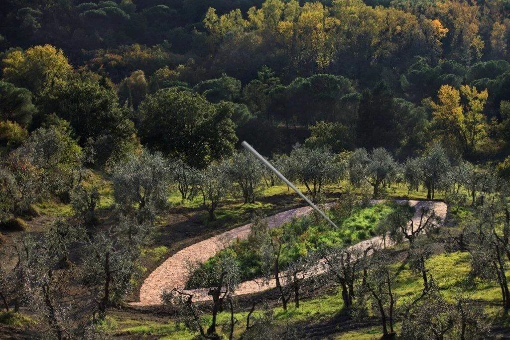 The Birth by Spear reintroduced the original olive trees to Tuscany in 2011. Through research, he found the original olive trees along with tress which would have coexisted with them two thousand years ago. Surrounding the forest are Renaissance terracotta tiles that were specifically fired in kilns from the 14th century. The spear at the center of the environmental landscape is an allegory for Minerva giving birth to the olive tree by thrusting a spear into the earth. Inscribed on tiles were comments from the community of Tuscany, young to old, expressing their meaning of the olive.